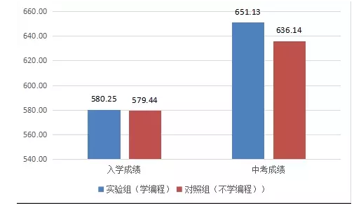 对2018届初中毕业生的成绩分析研究发现,研究对象中参加过编程学习的学生(实验组)与其他学生(对照组)相比,前者的中考成绩平均分足足比后者高出15分。